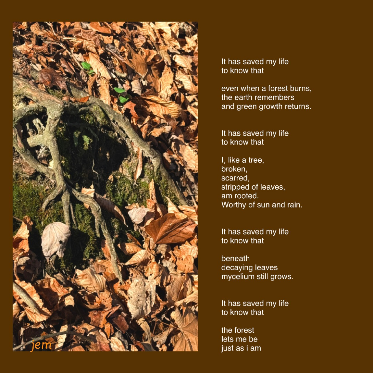 I call this a cairn poem. Gathered in the woods, built from what is seen, felt, and borne, and given form through a process of layering. Sometimes guided by image, sometimes by what is drawn and revealed. It takes from the natural world and returns to it a mark set alongside a photograph I’ve taken. As a cairn marks where one has passed, so each of these poems marks my life. A witness to what I have endured, what I have learned, and what remains.